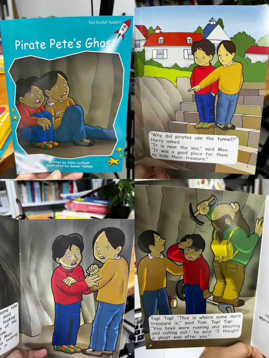 Fluency 2中,故事书带给孩子们的代入感非常强烈,包含了探险野营、户外骑行、搜寻营救等冒险故事,都是这个年龄段的孩子特别好奇,急需体验的。比如《Pirate Pete’s Ghost》,讲的是在一个幽暗的隧道里,两个小朋友讨论海盗鬼魂的故事。