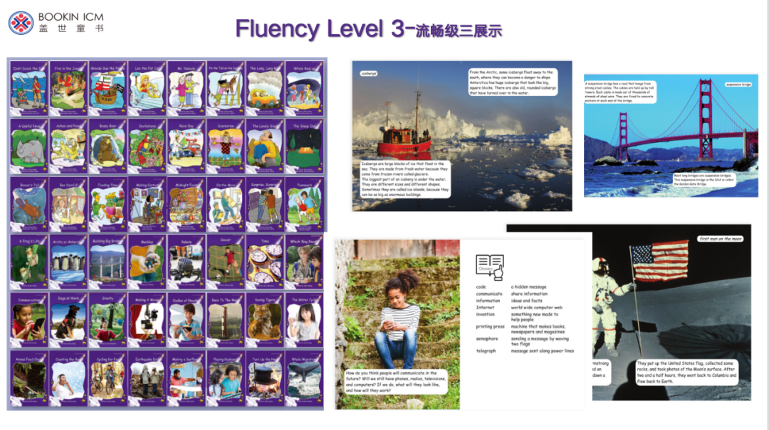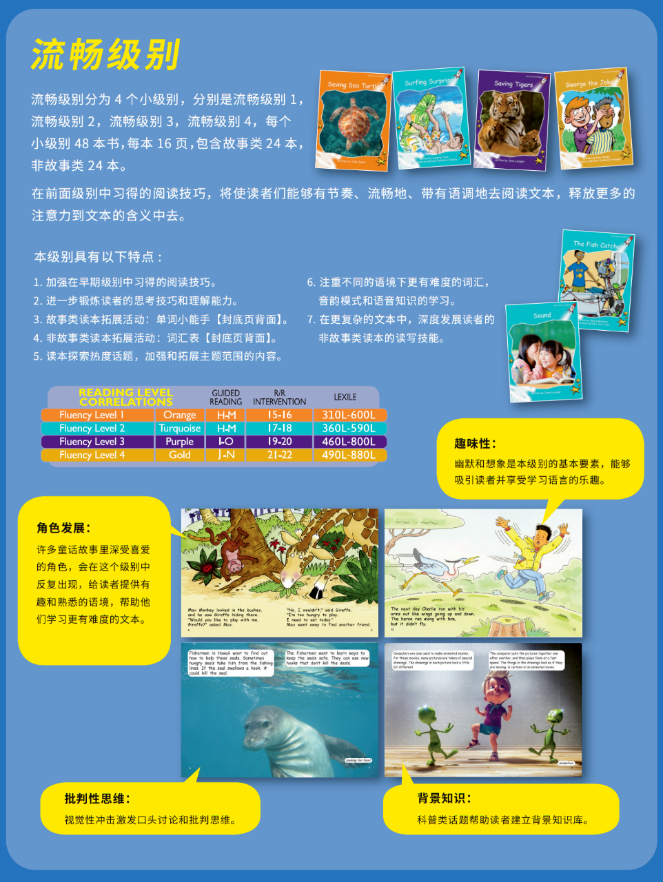 包含虚构类24本,非虚构类24本,蓝思分级指数在360L-590L,单本词汇量在270-400之间。这一级单词的数量上又有所增加,文字信息占比继续上升。语法知识和Fluency 1相差无几,内容都是孩子们的兴趣点,包含了记叙、说明、应用多种体裁。