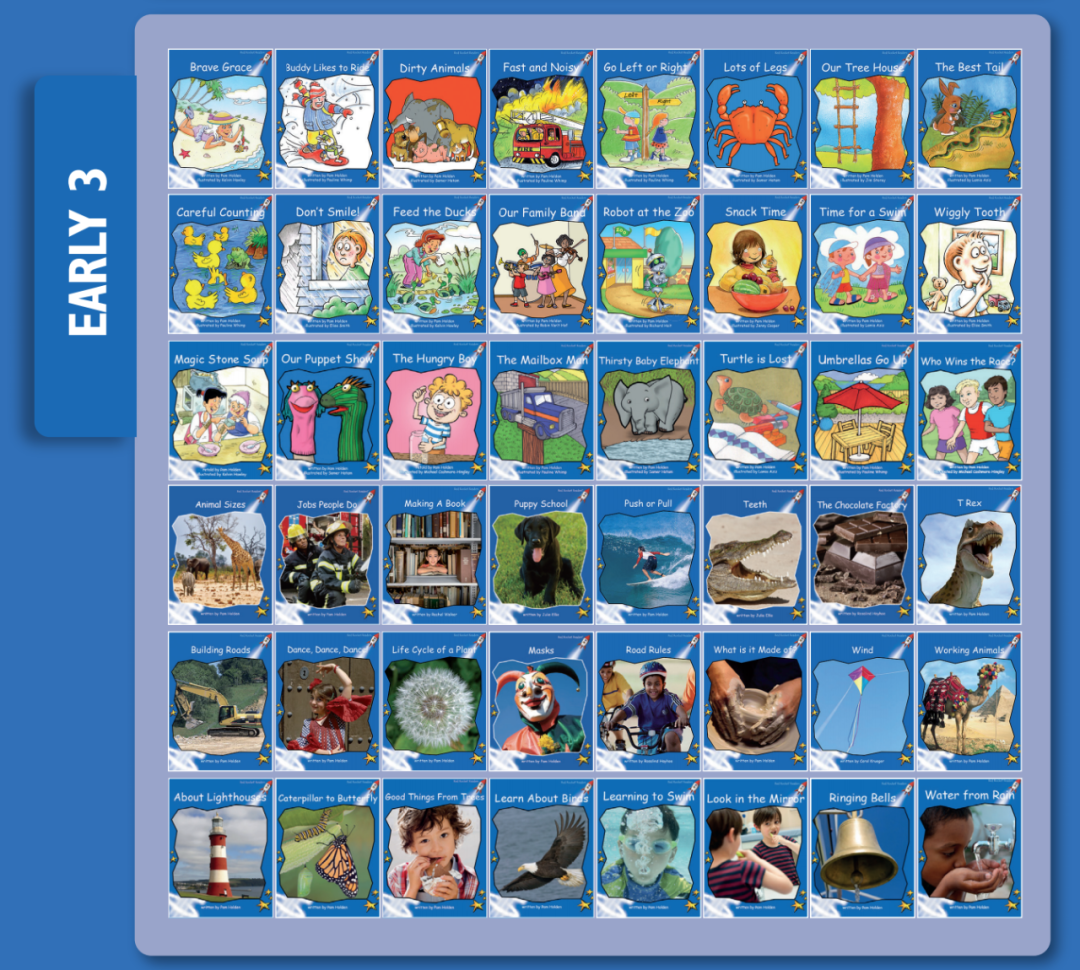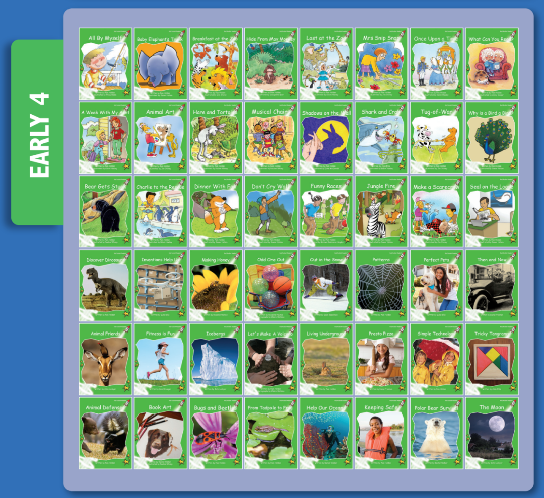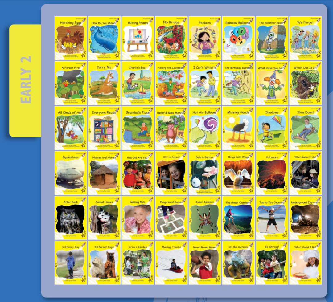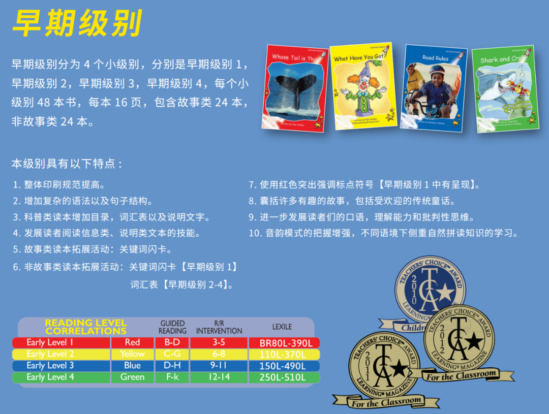 包含故事类24本,科普类24本,每本16页,单本词汇量在130个左右,句式比Early 1稍长一点,一幅图搭配的句子有三句。蓝思指数为110L-370L。