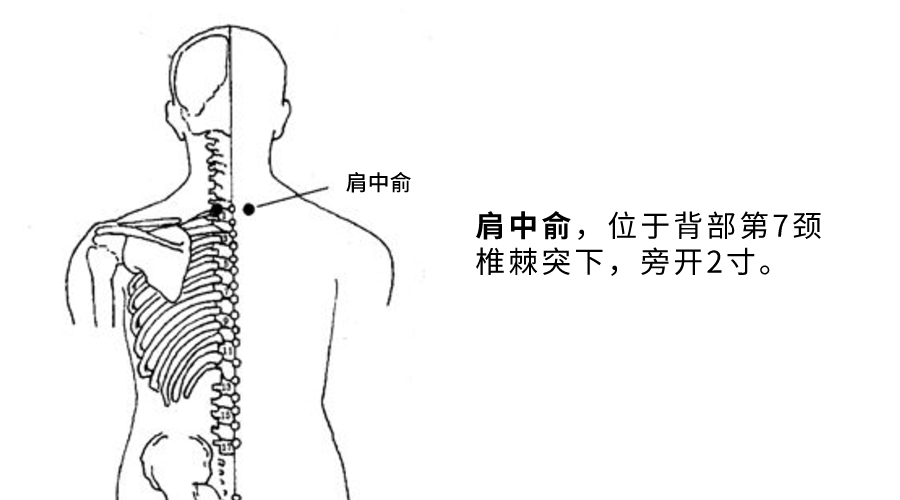 肩中俞,位于背部第7颈椎棘突下,旁开两寸。