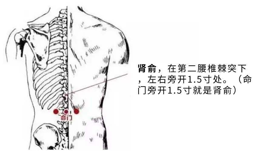 肾俞穴,在第二腰椎棘突旁开1.5寸处。后腰与肚脐正对的穴位为命门,命门穴旁开1.5寸就是肾俞穴。