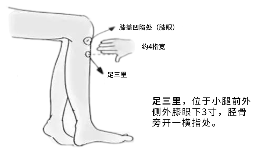 足三里穴位于小腿前外侧外膝眼下3寸,胫骨旁开一横指处。