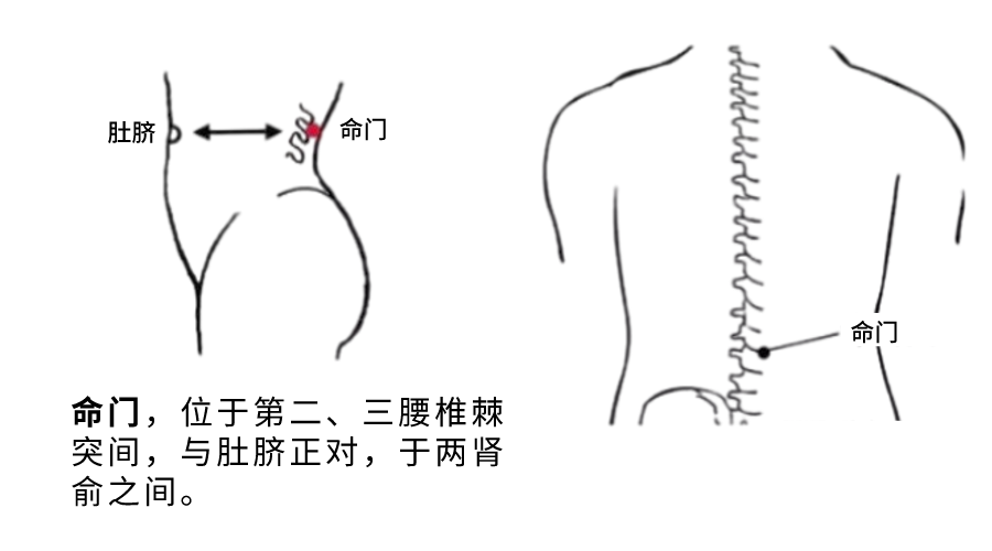 命门,属督脉,位于腰部,腰为肾之府,且督脉起于胞中,贯脊属肾命。命,指生命。门,指门户,为元气之根本,生命之门户,具有调理阴阳,平衡肾阳、肾阴的作用。