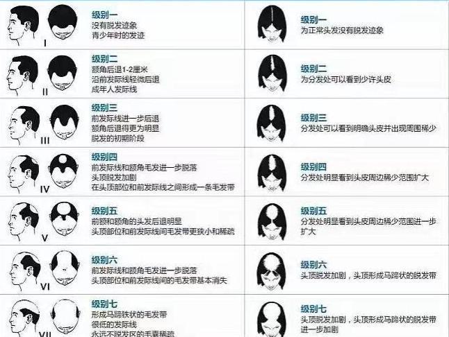 如果不知道自己脱发的程度,可以对照下图,来确定脱发等级。