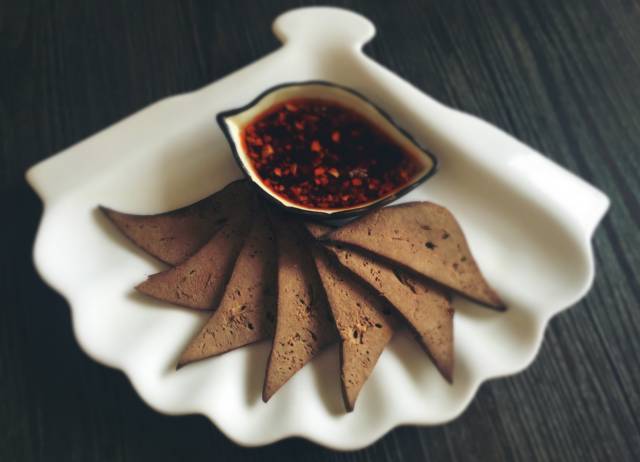 切好的猪肝摆成围碟,蘸料放在上面,好菜上桌啦!