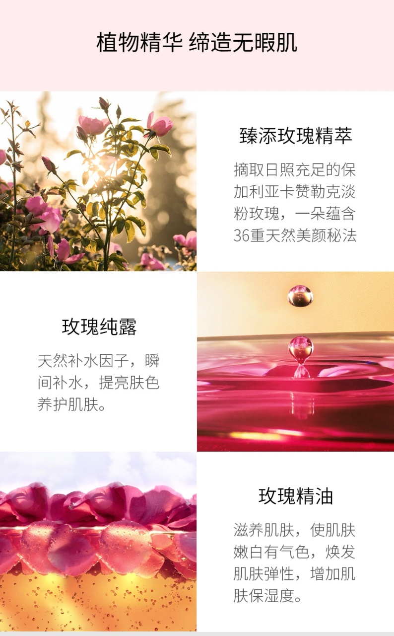 真刀实枪添加进去的玫瑰鲜花纯露基液以及一万朵玫瑰才能提炼出1克的养肤王者保加利亚玫瑰精油!