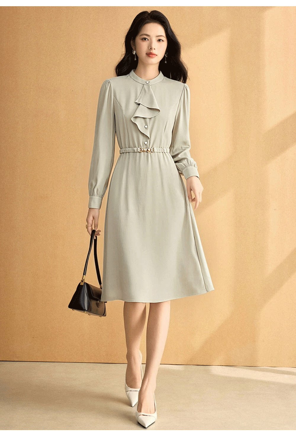 门襟处的精致纽扣与同色系腰带的金属扣饰,成为低调的点睛之笔,在简约中透露出品质感,彰显设计师对细节的把控。