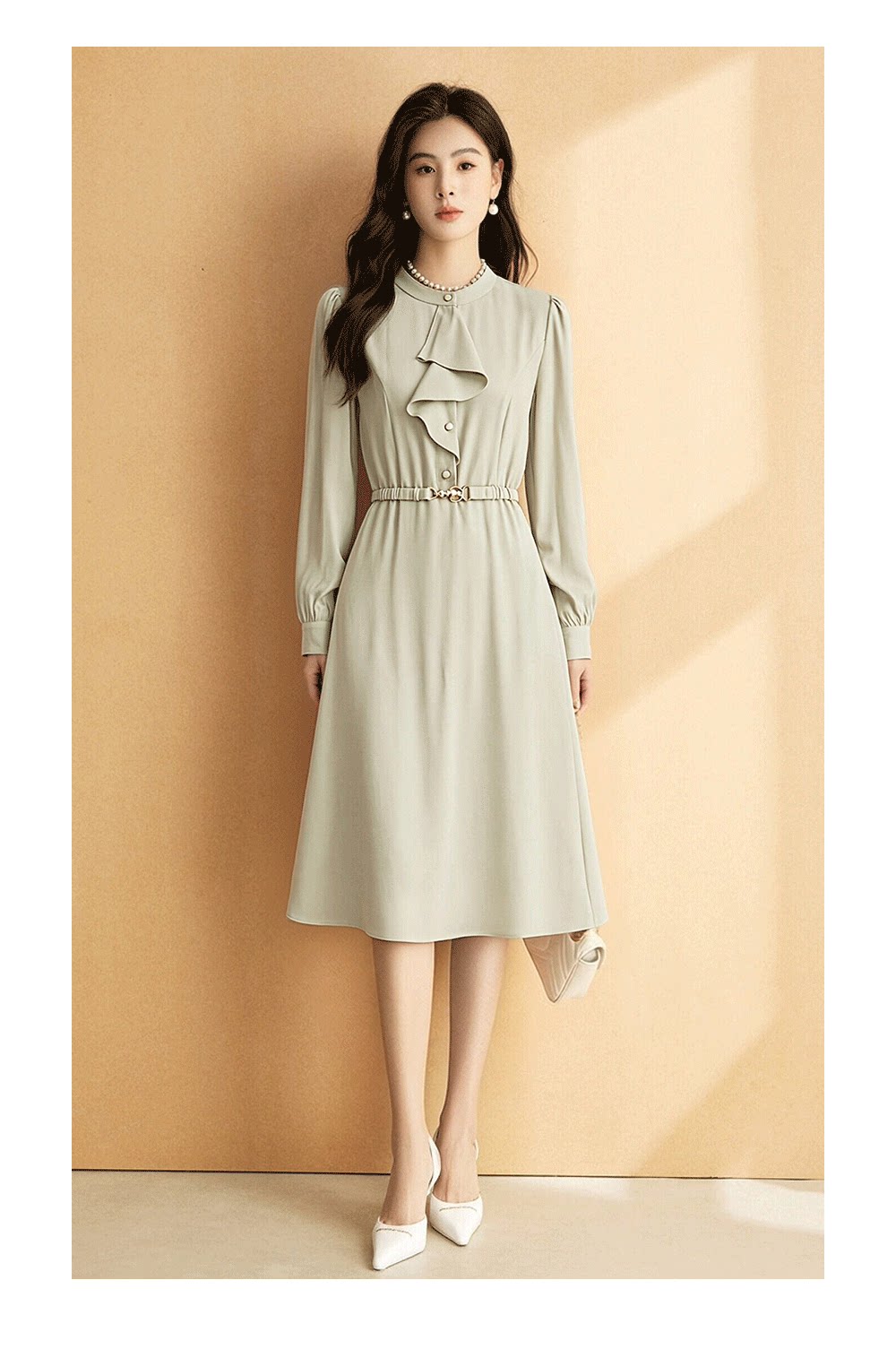 低饱和的灰调浅绿,如同早春的晨雾,自带高级滤镜,既不挑肤色,又能轻松搭配各种配饰,让整体造型更具层次感。