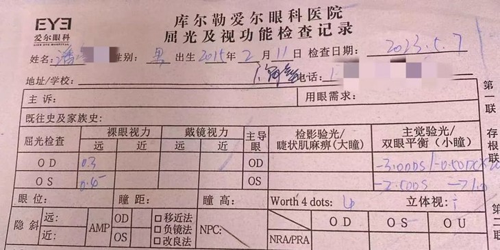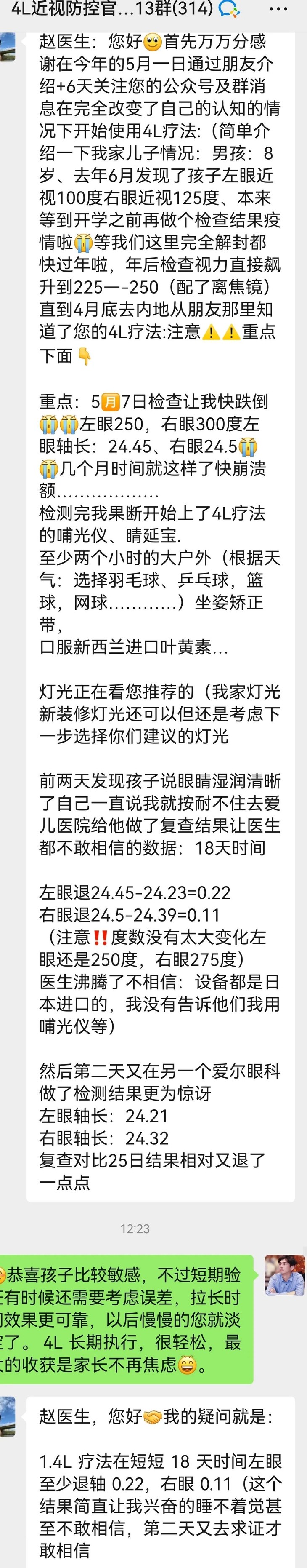 在朋友介绍下,家长关注到了4L疗法,完全改变了对近视的认知。5月7日孩子再次检查,左眼250度近视,右眼300度近视,左眼眼轴24.45mm,右眼24.50mm。“几个月时间就这样了,快崩溃了”。
