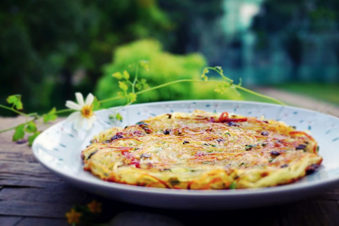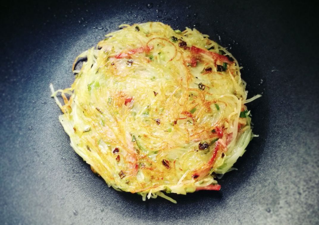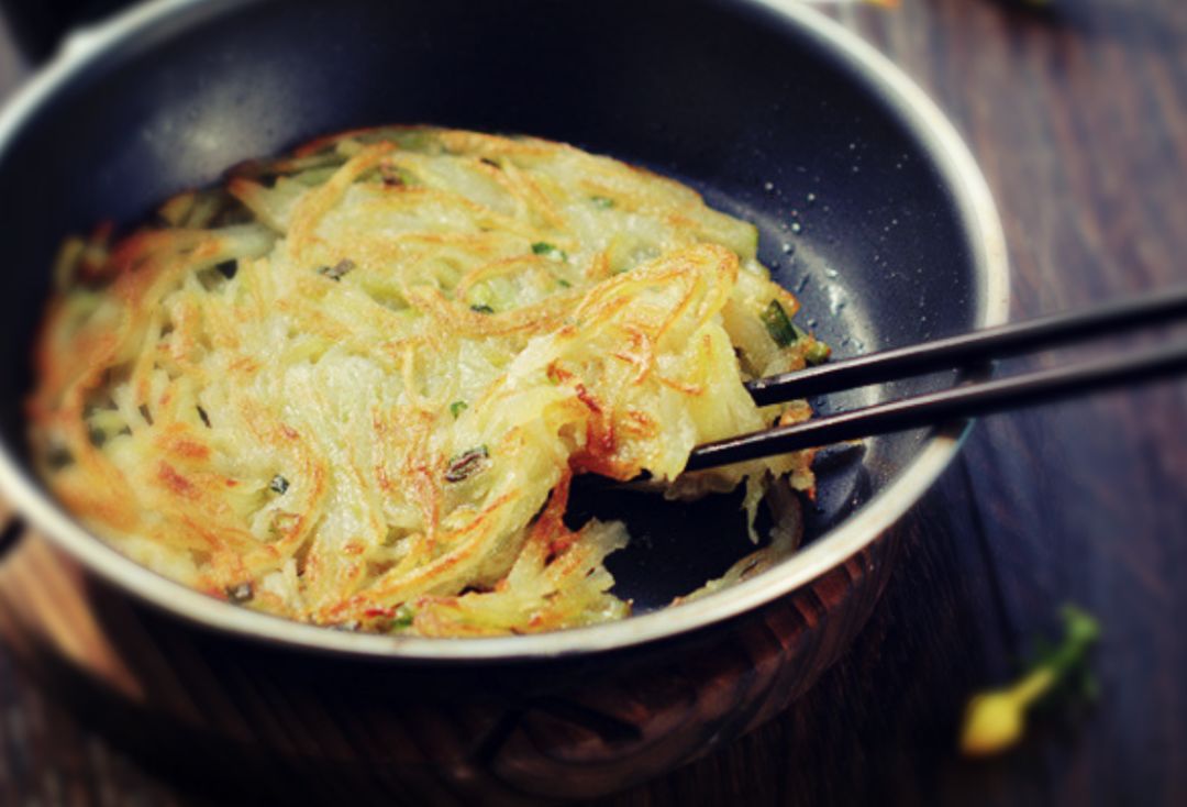 3、将锅洗净后添1勺豆油,油热后关火,将土豆丝均匀撒入锅中,压实,开大火,平均3秒~5秒晃一次锅,如此持续1分钟;