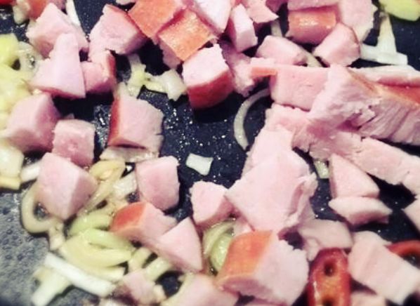 1、热锅凉油,油热后关火,放入姜末,火腿肠(或猪肉馅),翻炒均匀,不粘锅后重新开火,放入葱花,一大捏十三香,1勺生抽,一捏盐炒,匀后关火;