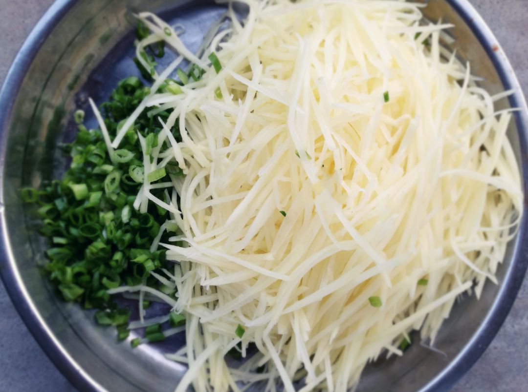 1、将土豆洗净后去皮檫成丝,切小葱花备用;