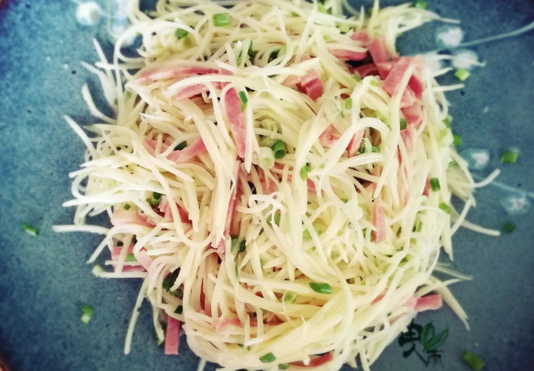 2、烧半锅水,水开后放入1勺盐,倒入土豆丝,再次开锅后将其捞出,过凉,沥干水分;