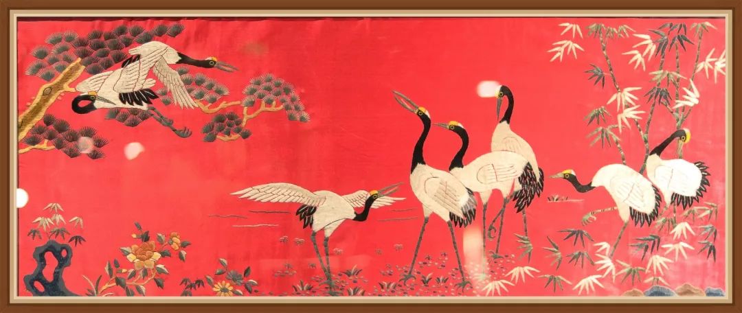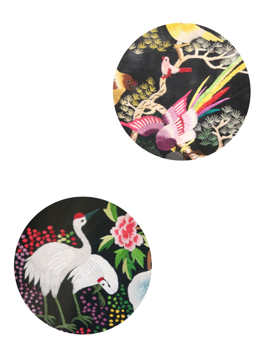 拖着彩尾的丹鸟落在枝头,似是在炫耀它漂亮的羽毛;两只洁白的仙鹤屹立在彩色石子边,向我们展露风姿……在这幅绣品中我们可以看到吉宇鸟脚踩青石之上,面对周遭盛开的繁花,腾飞的群鸟傲气、端然,它拥有最绚丽的色彩,最鲜活的崇拜,它用无言的方式守护着它的同伴。在和煦的春日里,花鸟怡然自得,氛围祥和美好。