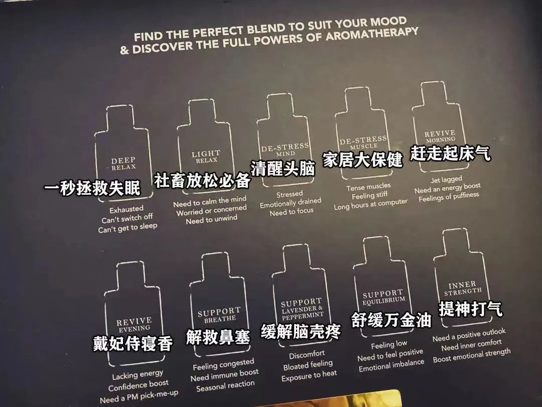 一整盒就是一个“小药箱”:比如肌肉酸疼,有De-Steress Muscle应对;疲劳、焦虑、烦躁 ,Light Relax和De-Stress Mind我就换着来用;感冒鼻塞,还有负责通鼻子的Support Breathe~