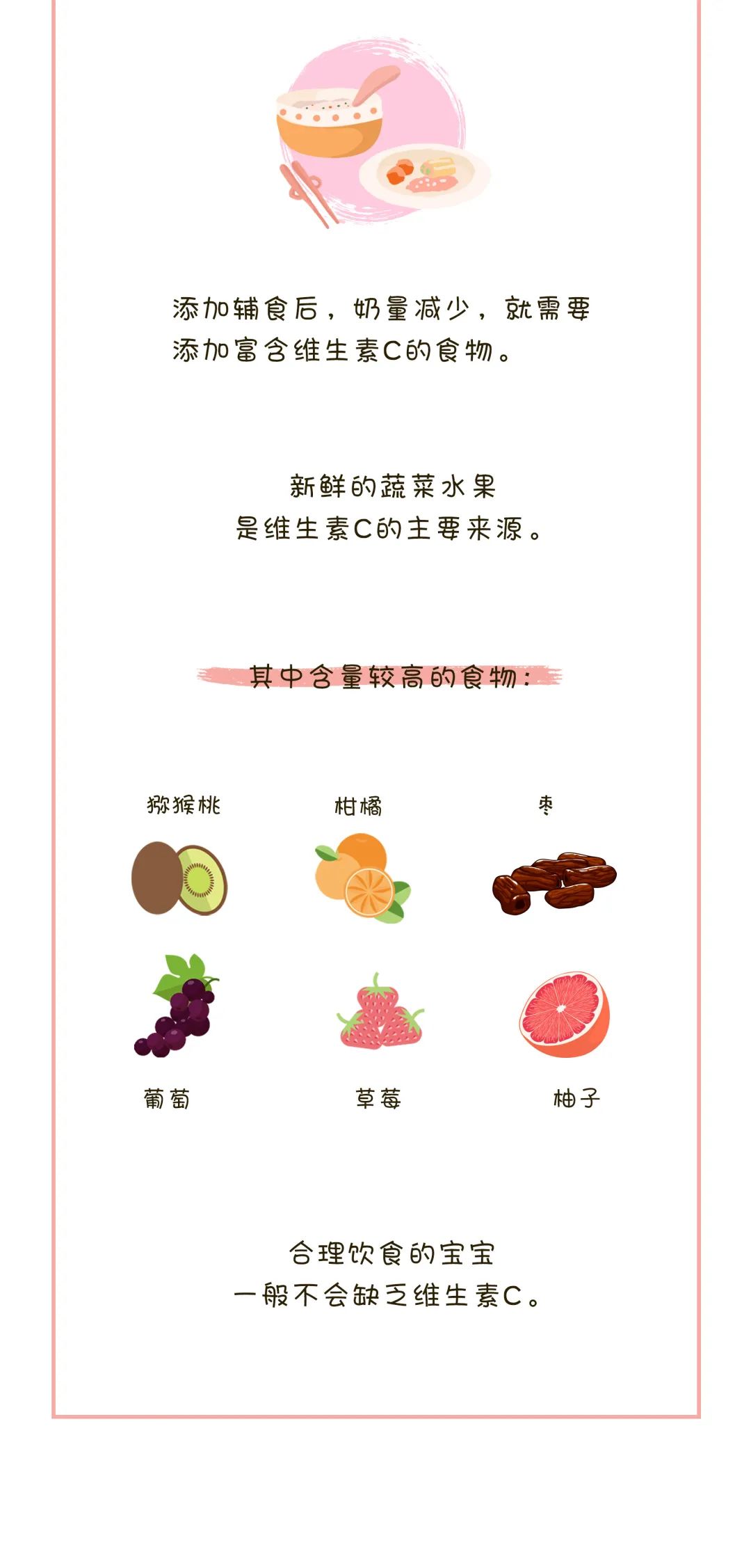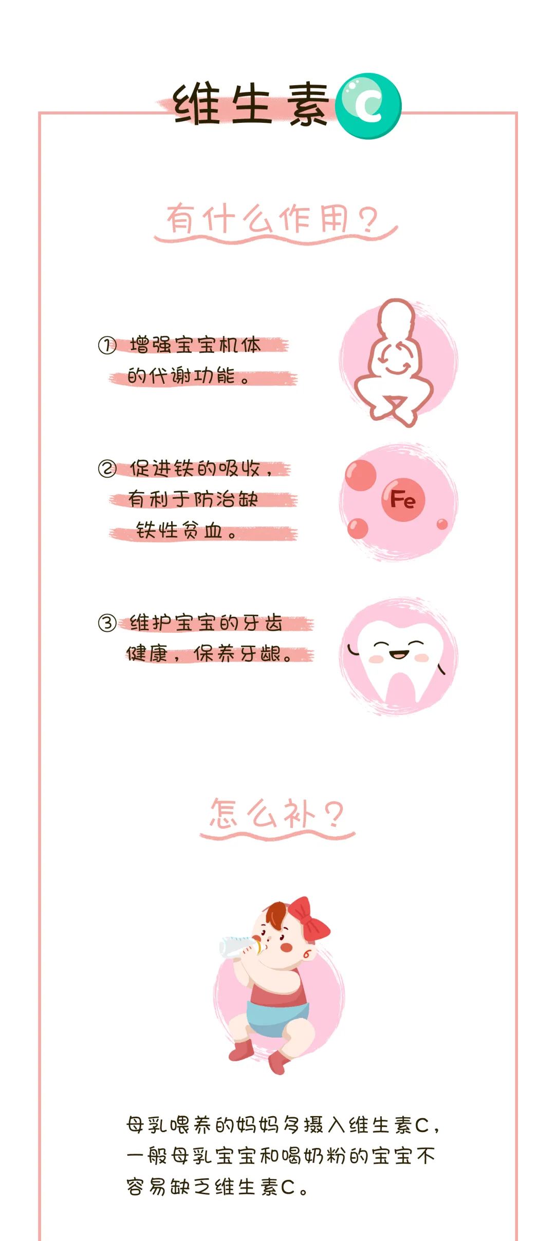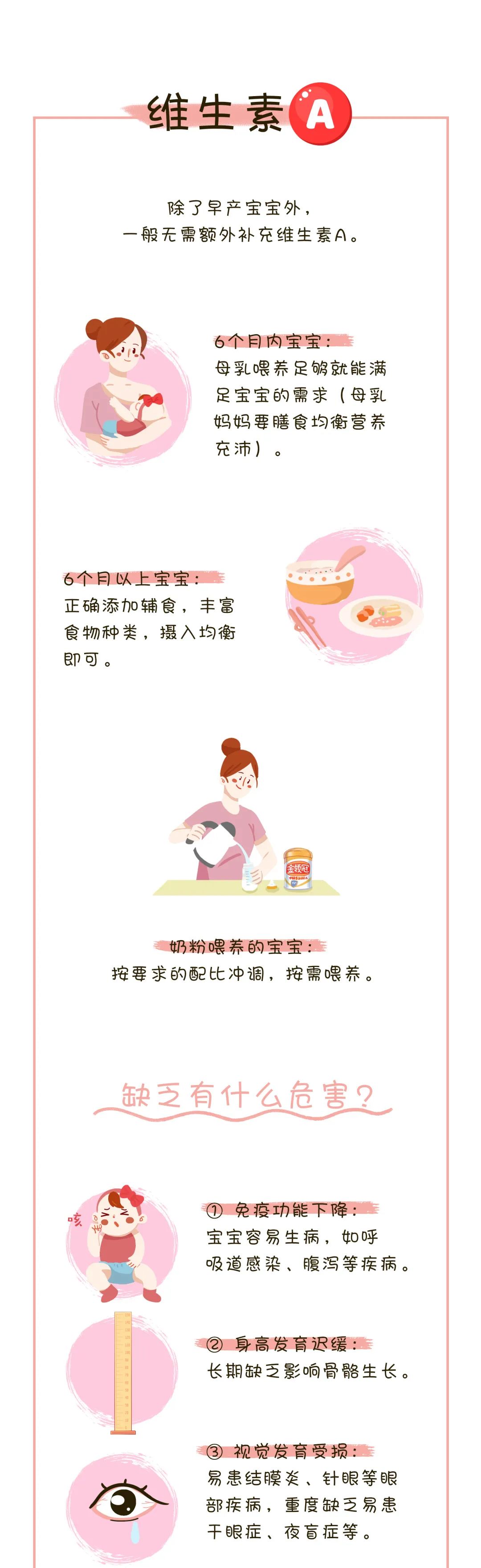 维生素A素有“眼睛的守护神”之称,也是增强宝宝呼吸道防护力的关键,它与维生素D一起,促进宝宝骨骼发育、身高增长。而维生素C有助于受损皮肤的愈合,防止细菌入侵。