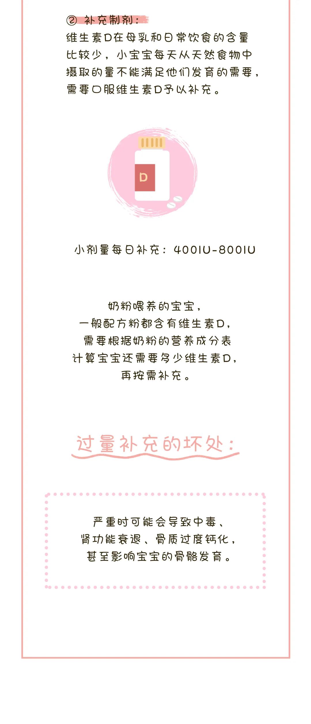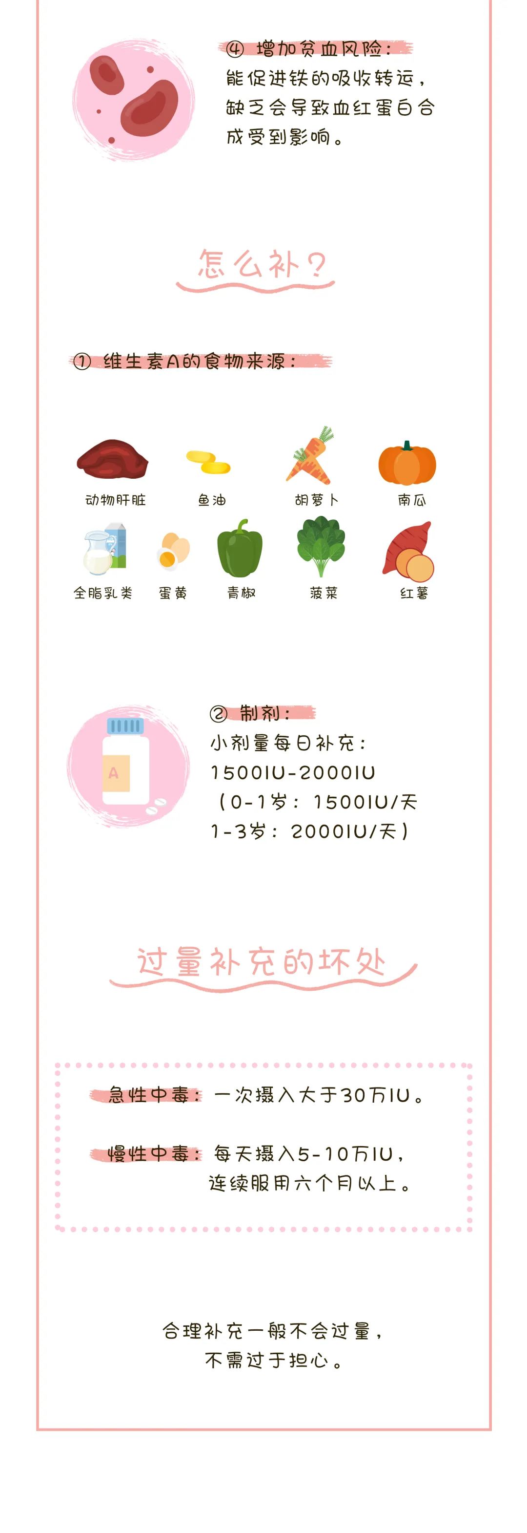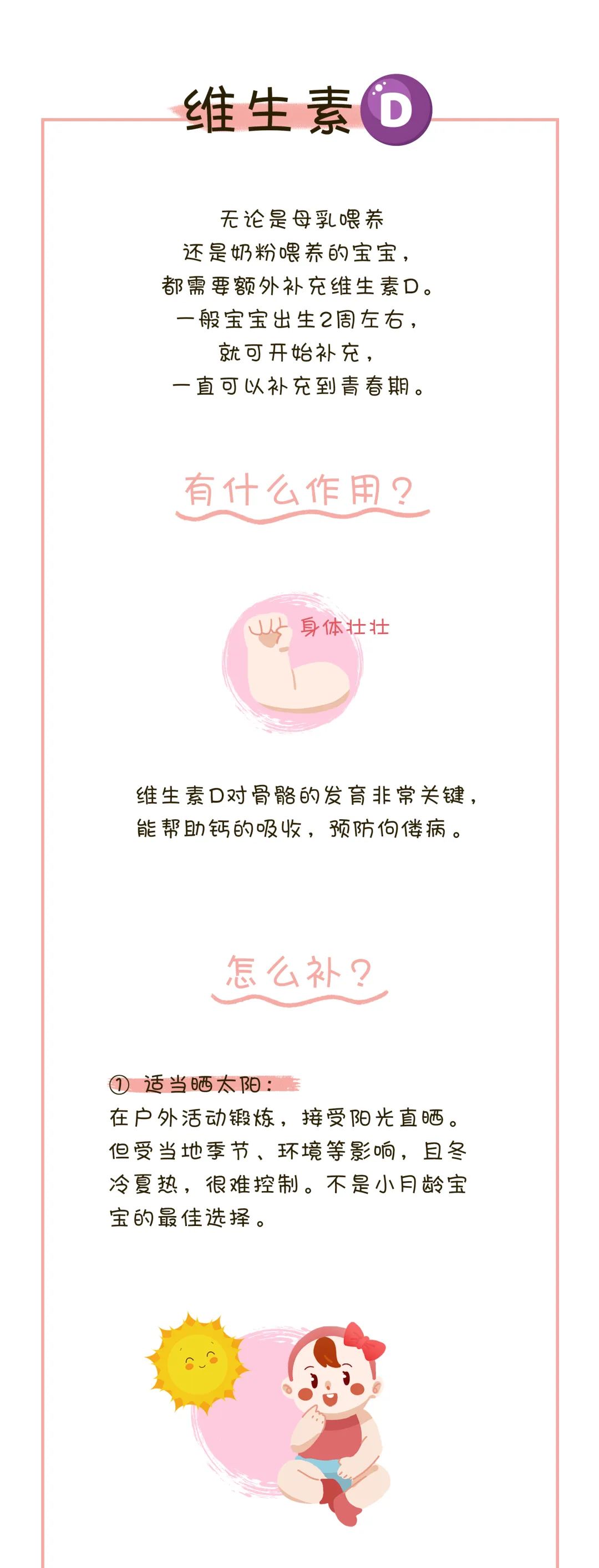 按照上述所说,一般情况下,维生素A、C是不需要特意额外补充的,但如果宝宝存在挑食、对某些食物过敏、摄入奶量不够等,无法从正常饮食中摄取时,建议额外选择补充制剂。维生素D,一般宝宝在出生2周左右,就可开始补充,一直可以补充到青春期。