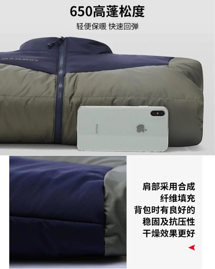 棉羽混合填充设计,肩部采用了Ajungilak 保暖棉,能够实现更好的抗压和回弹性,其余部分采用了650蓬羽绒填充,表面面料采用了英国的pertex面料,防风放泼水!