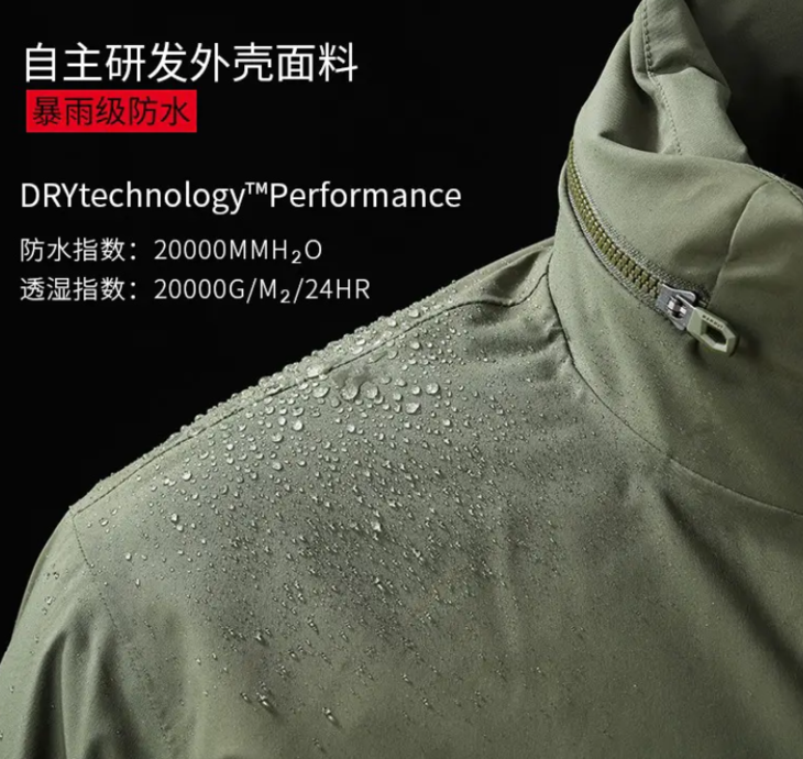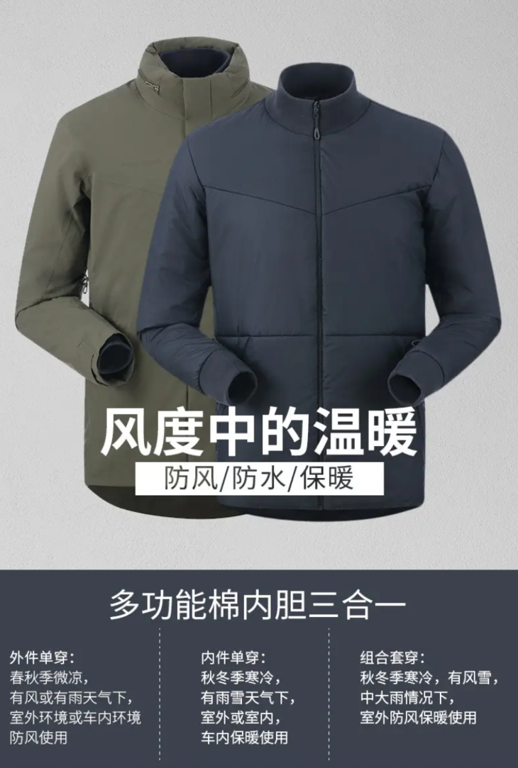 男士 DRYTECHI防风防水保暖,可拆卸多功能硬壳棉服三合一夹克,防风防水保暖御寒。自主研发面料,防风防水,透气性能更进一步加强。中空管状纤维结构,,轻量保暖,易于压缩收纳。