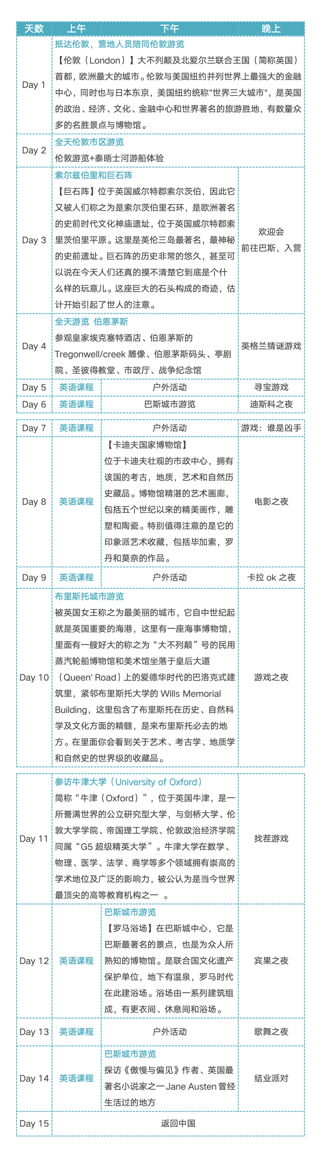 营中会在英国历史名城采风,领略伦敦世界金融中心的震撼,感受布里斯班历史名城的文化底蕴,探访牛津的世界名校,探究巨石阵世界建筑之谜,在世界博物馆中欣赏世界艺术的凝结……