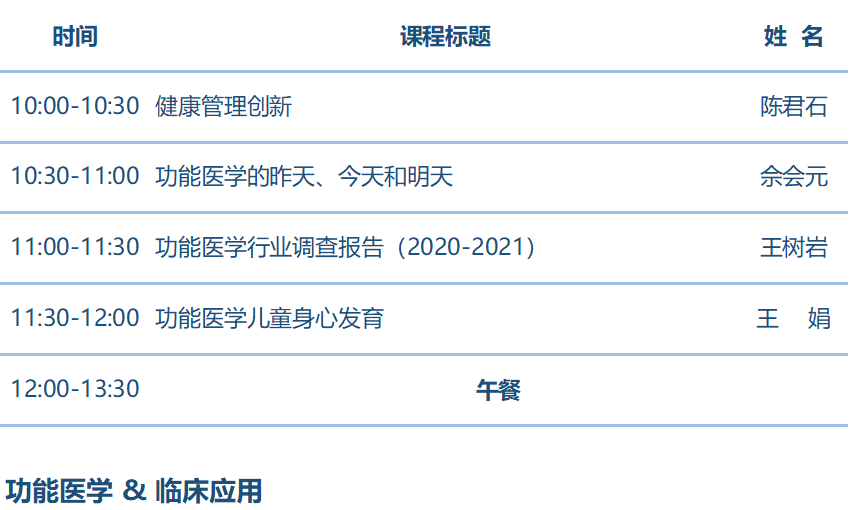 | (含会议资料费+18日、19日喜来登商务午餐+18日晚宴、及《2020-2021功能医学行业调查报告》1本) | (含直播+回放+纸质版《2020-2021功能医学行业调查报告》1本) |