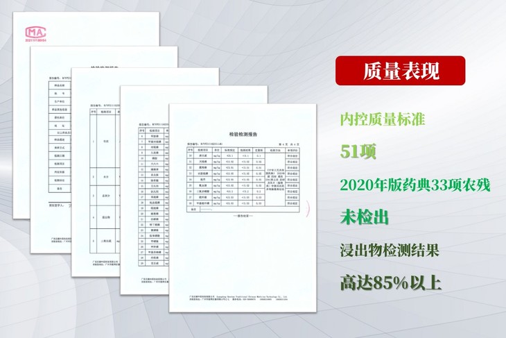 后续的采摘加工流程也全程监控,出厂检测严格,内控标准有51项,高于国家药典标准,浸出物含量高,33项农残未检出,这样的产品吃着才放心。