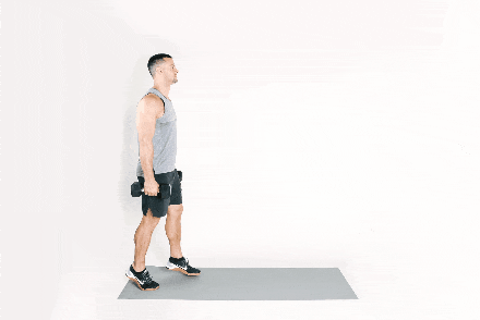 动作要领:双手各持一只哑铃,踮起脚尖直立,保持踮脚状态向前行走60秒,注意踮脚高度不变。