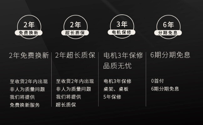 好的售后服务当然也不能少,比如在收货两年内出现非人为损坏可以免费换新,另外电机保修是3年,桌架和桌板是5年保修。