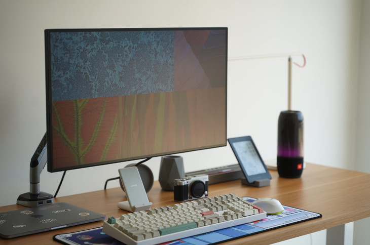 除此之外,乐歌E2还配备了一个可旋转+升降的D8A的显示器支架臂,无论是桌子还是支架臂都很符合人体工程学。我用的显示器底座上可以上下升降的,但是很遗憾没有办法左右移动,这样也就不能时刻根据需求调整角度,这对于需要长时间坐在电脑前面的我确实不太友好,而乐歌配套的这个支架臂就很好的解决了我的需求,而且用支架臂也可以给桌面腾出更多的空间,我自然就装上了。(当然,装支架臂的前提是你的显示器要支持壁挂)
