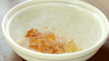 取一碗,倒入炖好的燕窝,在碗的一侧放入3颗石蜂糖和适量桃胶(石蜂糖放在桃胶下面比较容易化开),在碗的另一侧倒入黑枸杞水,撒上少许桂花(也可以换成玫瑰花)。