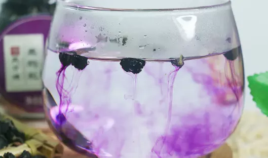 注:黑枸杞中含有花青素,花青素遇偏酸性的水,会呈现紫色,遇到偏碱性的水,则会呈现蓝色。