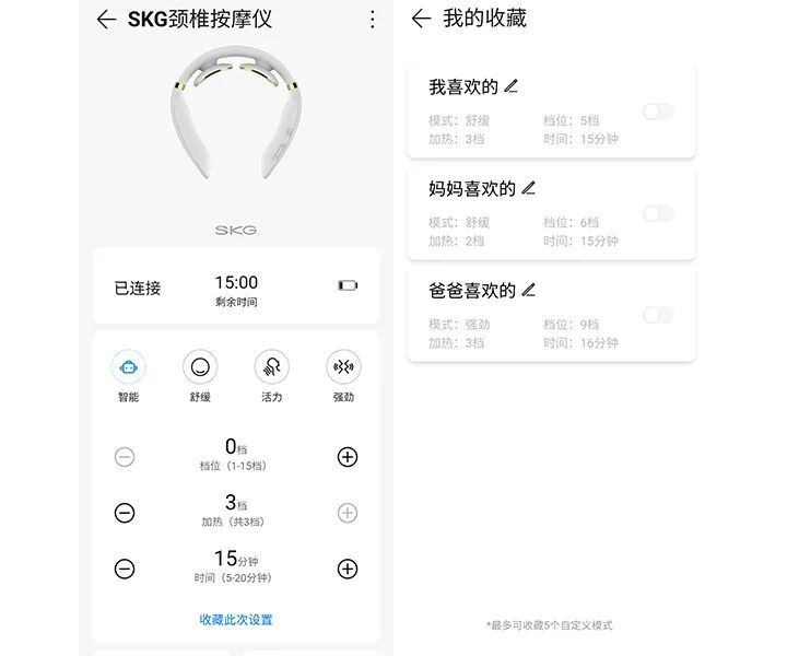 这款由华为技术研发的App不仅能够调节模式、力度、按摩时间、热敷档位等选项,还能收藏当前喜欢的按摩方式,下次按摩时可直接选择自己或家人喜欢的按摩方式,按摩时全程清晰直观地显示在手机上,滑动选项就可以轻松的调节力度、档位等,更方便快捷。