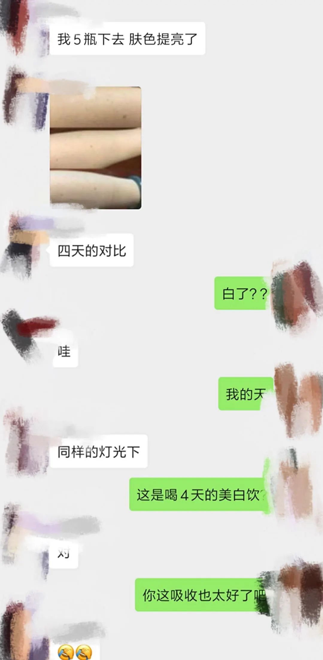 第三个疗程就很明显了,也就是我喝到9-10盒的时候。全身的肤色开始明显变白,明显到什么程度,就是胳膊,腿,手,但凡是之前被太阳摧残过的地方都白回来了。