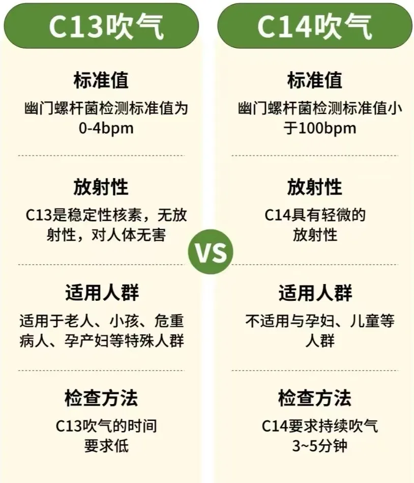如果胃里有幽门螺杆菌,那么呼出的气体就可以分解出含有13C或14C标记的CO2,并显示为阳性,由此即可分辨自己是否感染幽门螺杆菌。