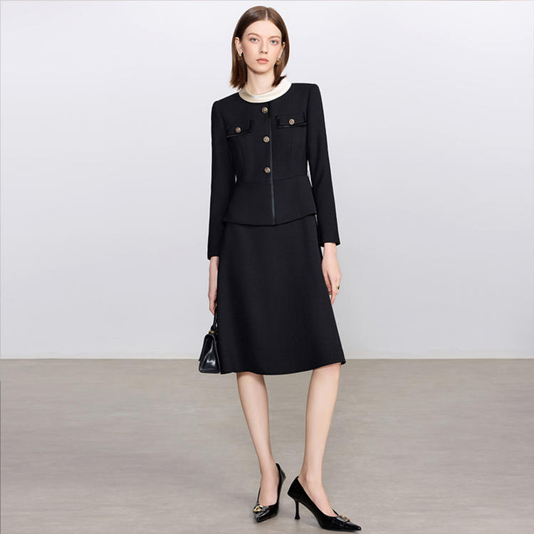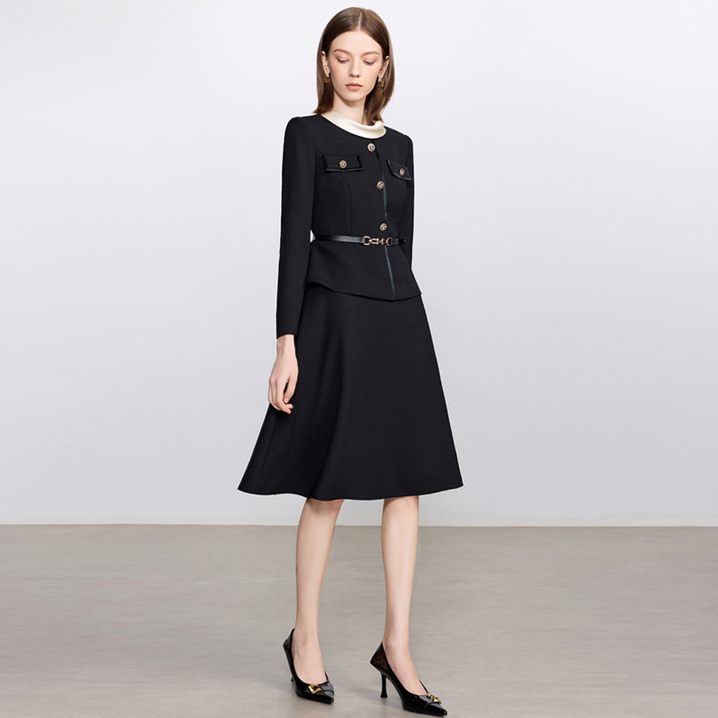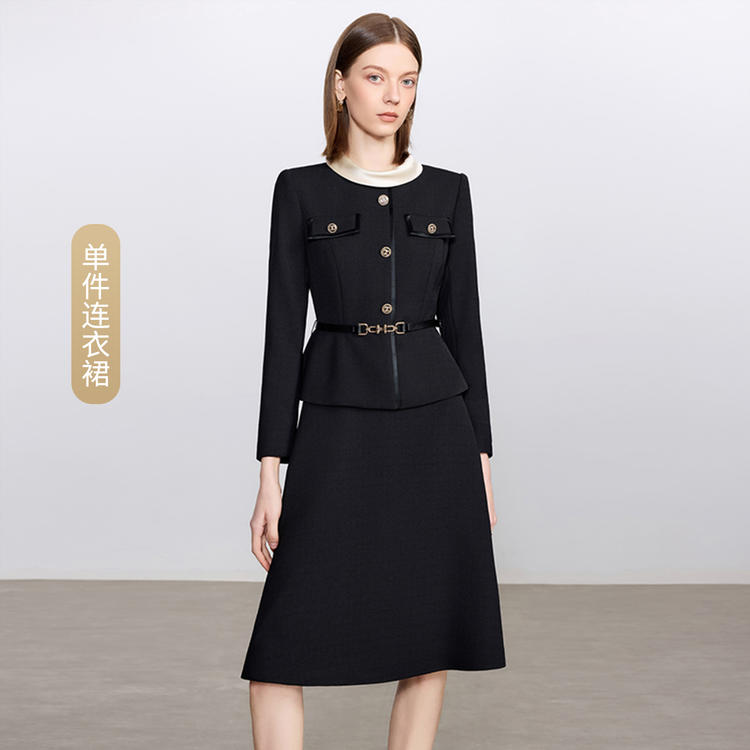 当香槟色缎面领的柔润光泽邂逅经典黑色裙身,当金色金属扣的复古质感融合小香风的精致剪裁,一件专为秋日职场女性打造的“法式优雅战袍”便应运而生