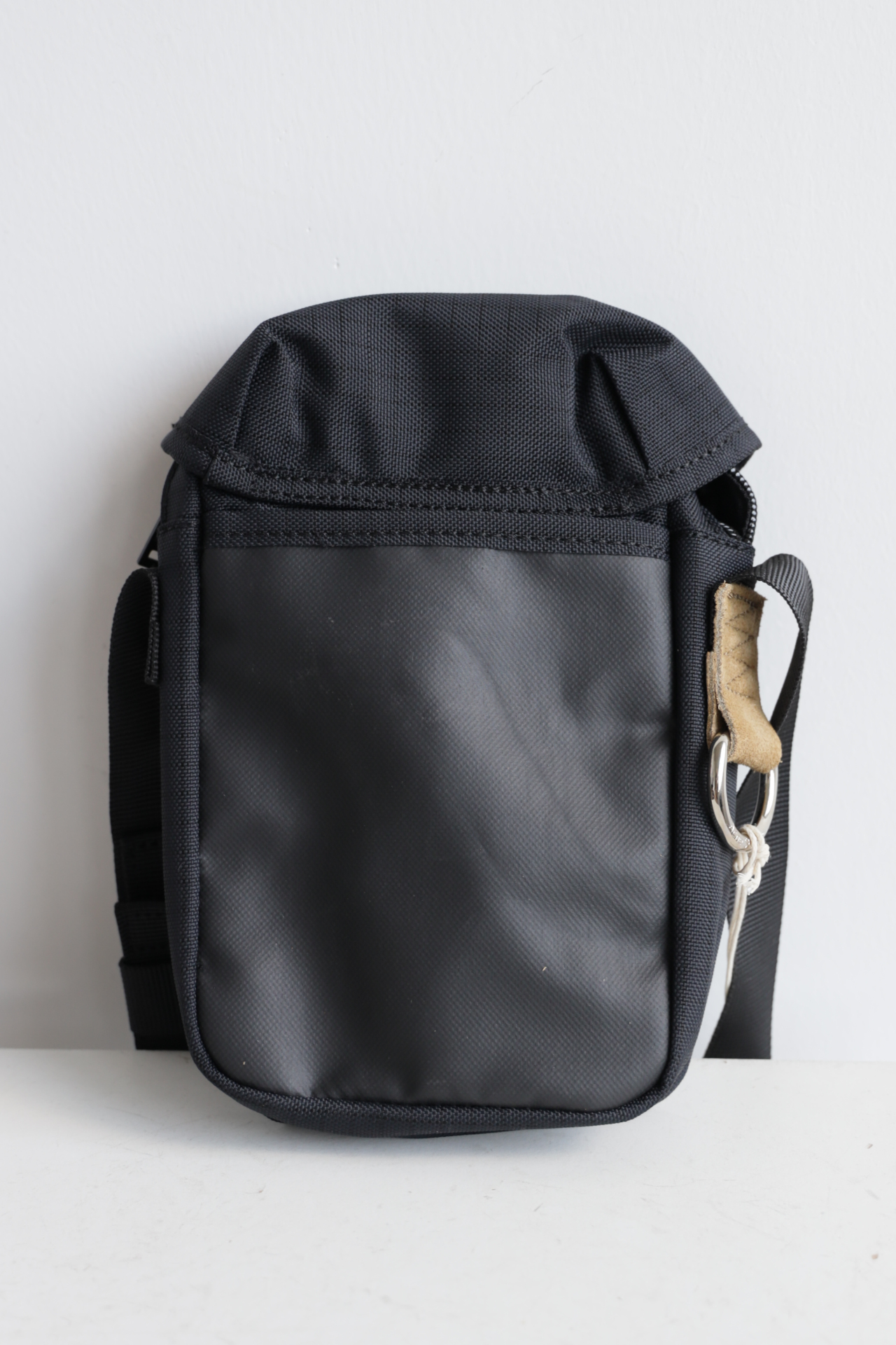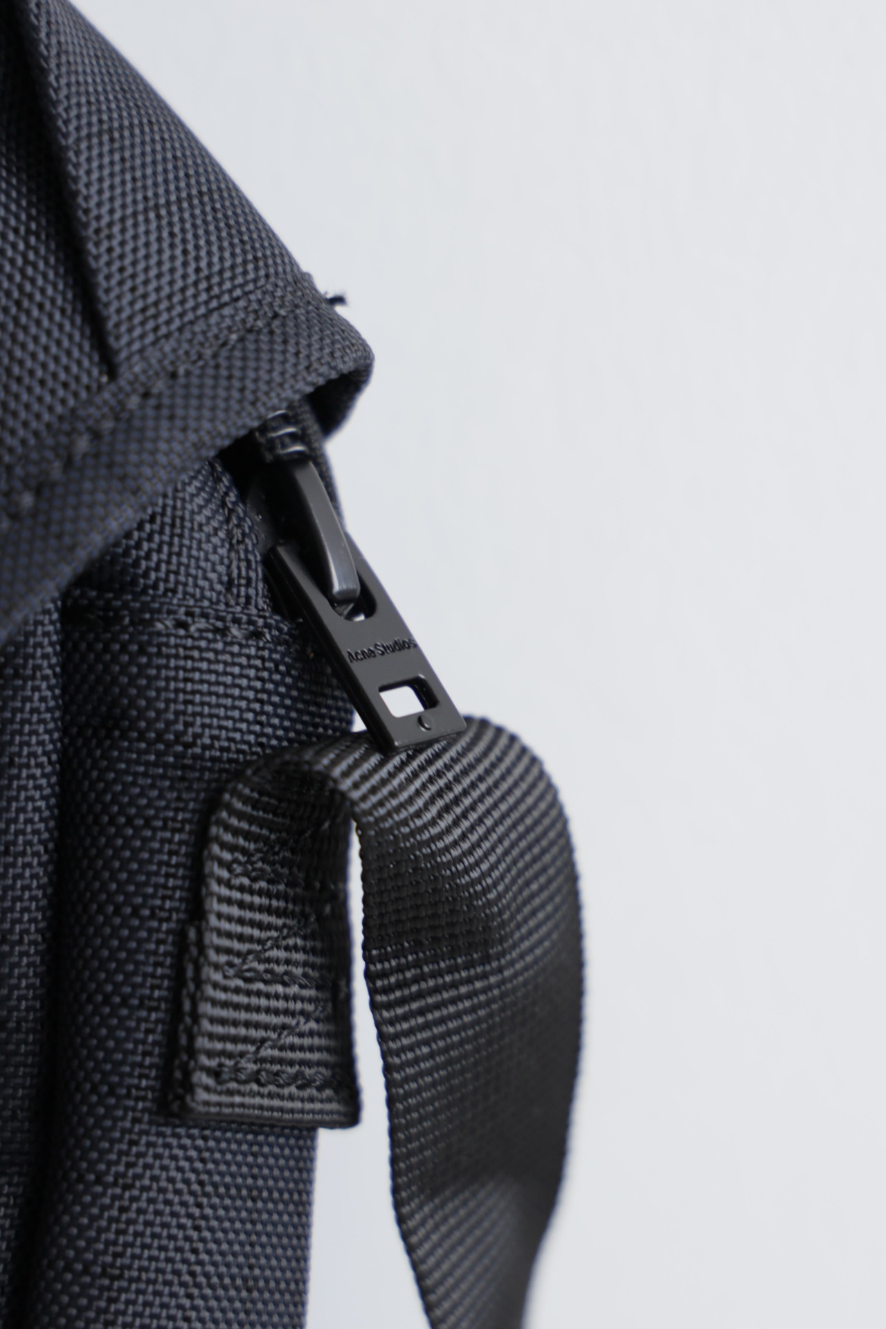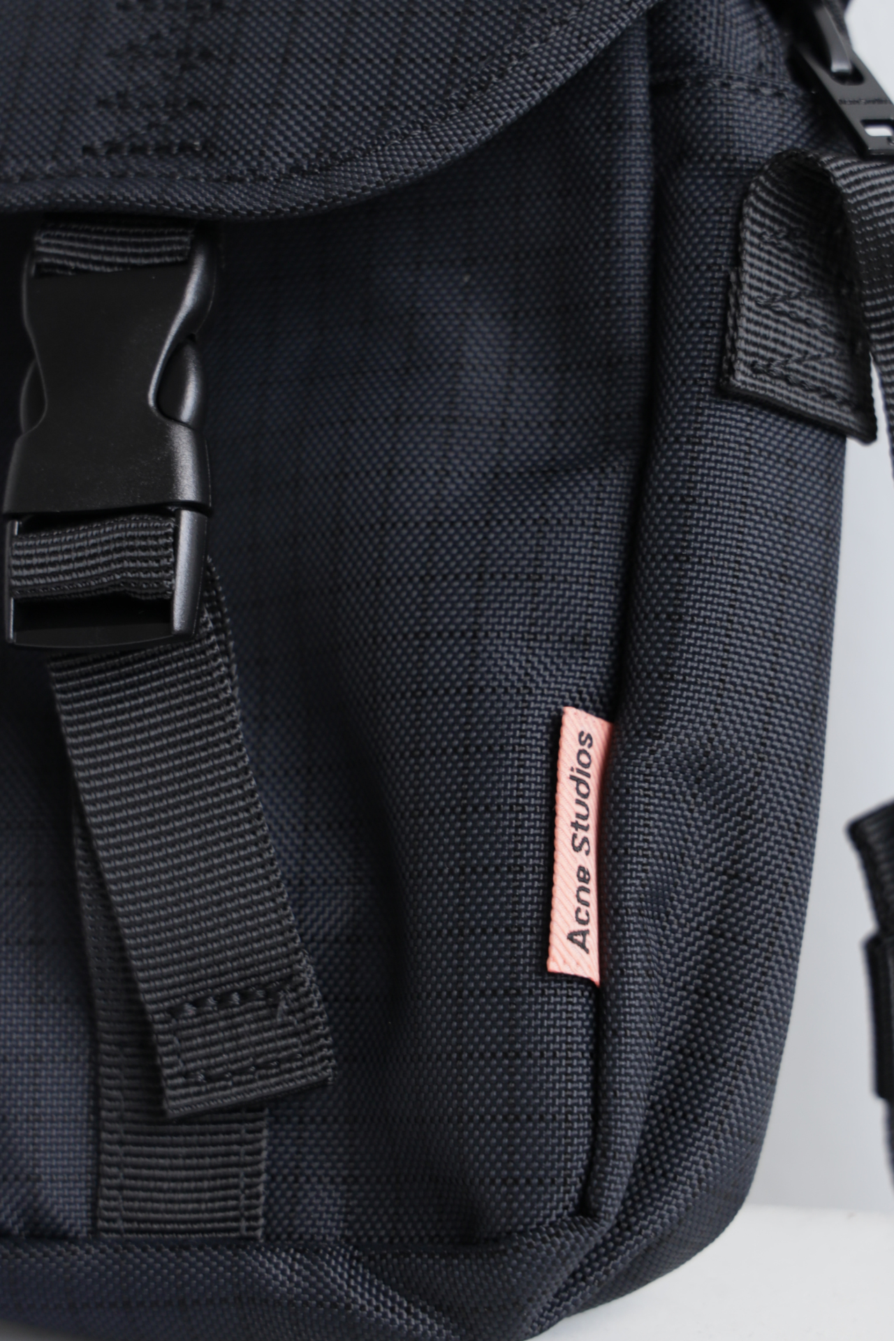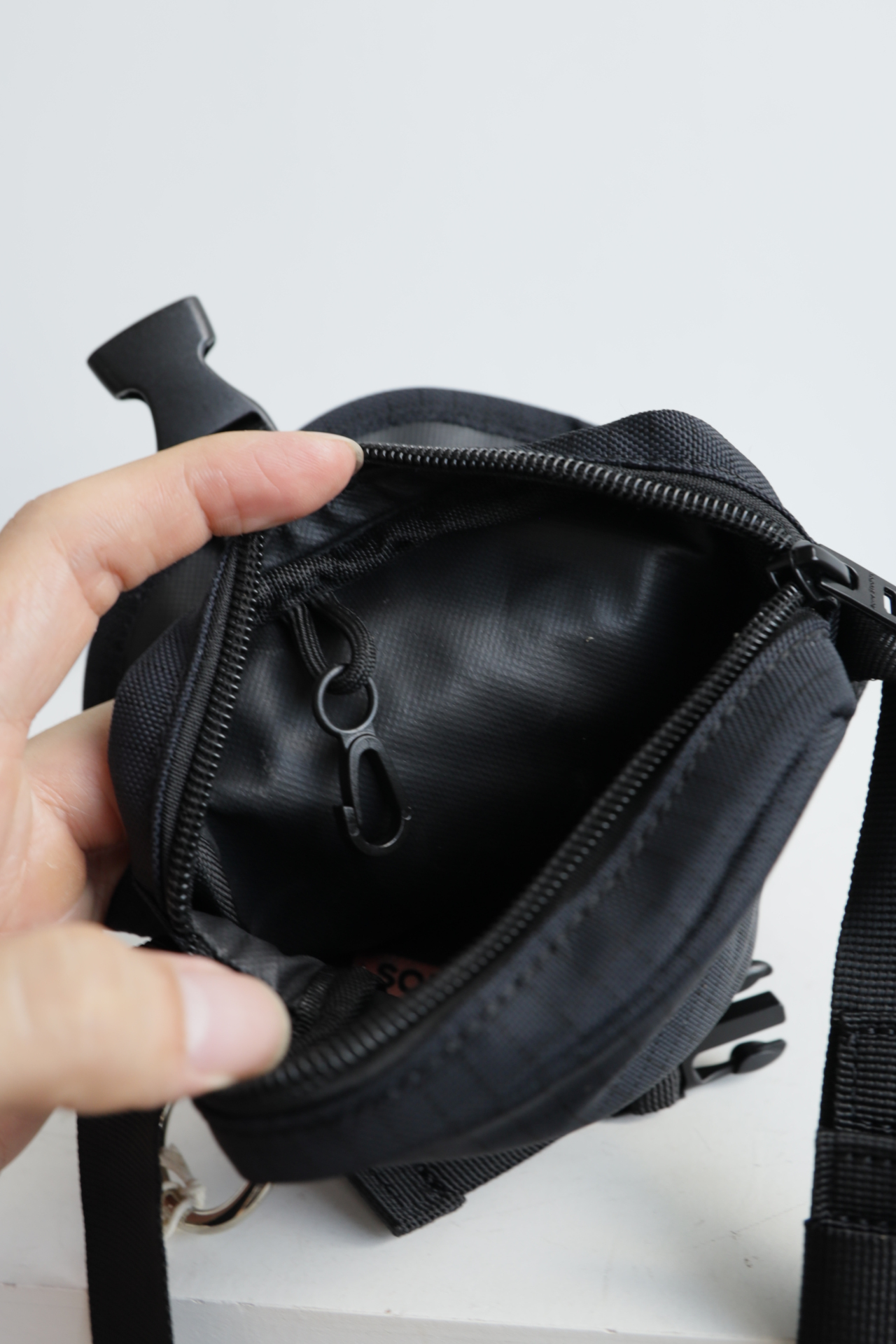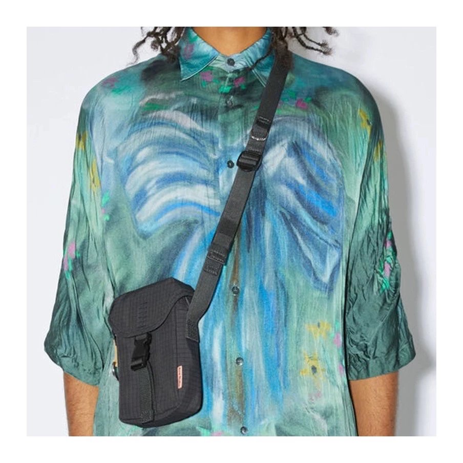 此款迷你包袋选用防撕裂锦纶面料制成,饰有品牌徽标图案。配有可调节斜挎肩带。