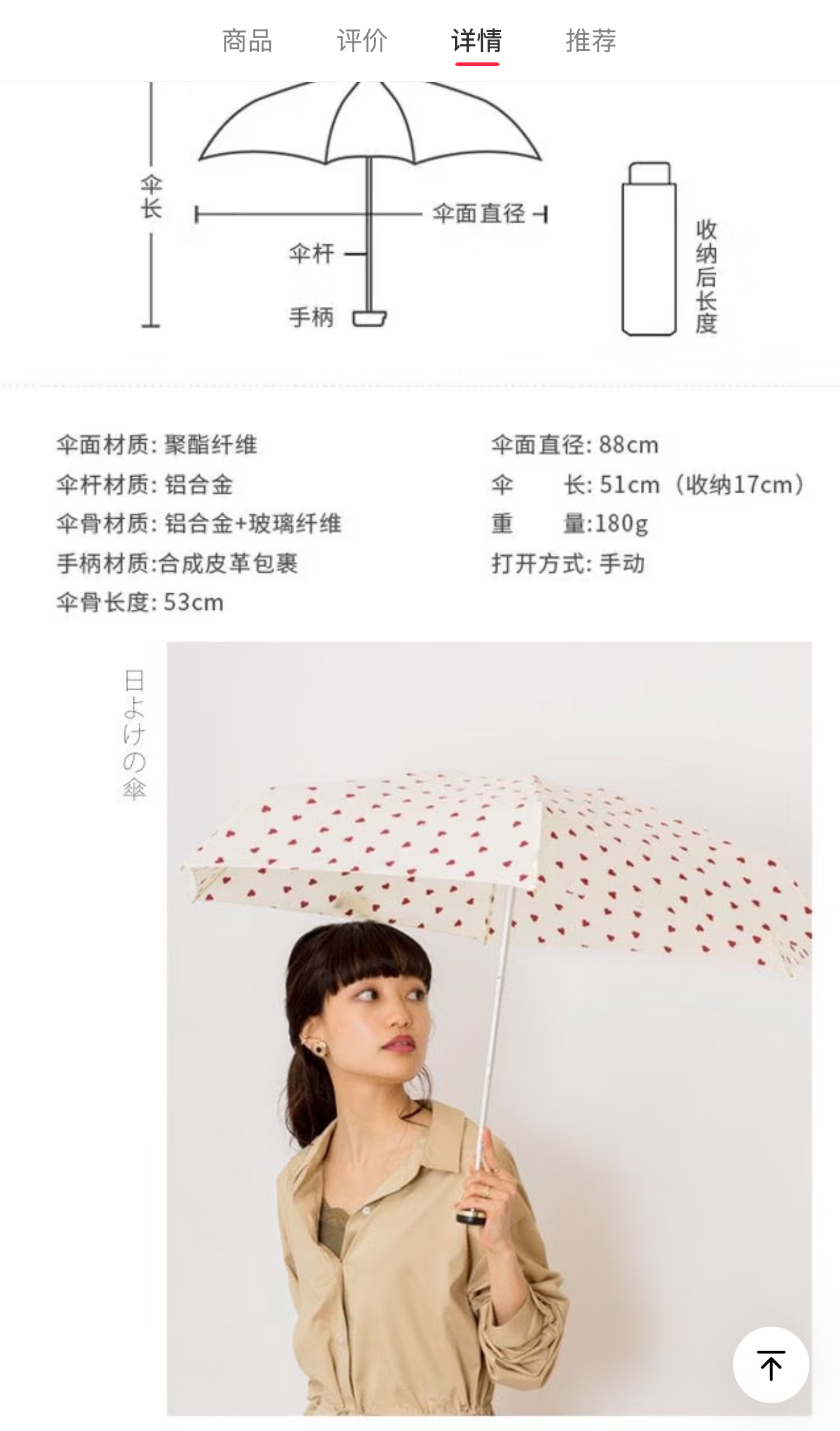 舒适皮革手柄,精致美观,入手稳定,随心把握,轻量化设计,小巧便捷,携带方便,放在包包里也不占地方,一把伞满足不同场景的使用。