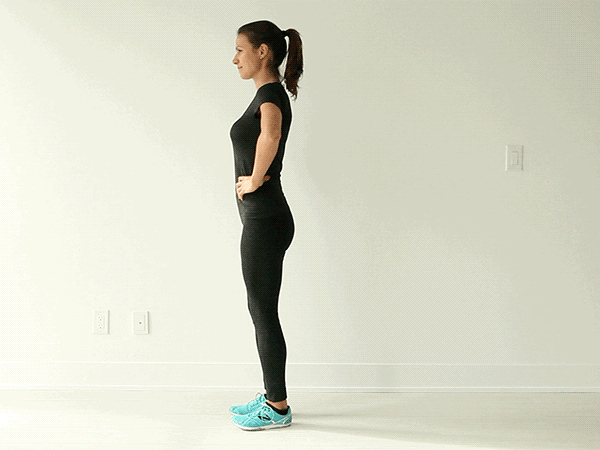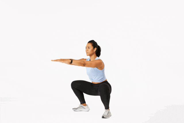 2、收紧腹部,屈髋屈膝下蹲,想象自己要坐在身后的椅子上,膝盖不要超过脚尖,蹲至大腿与地面平行。