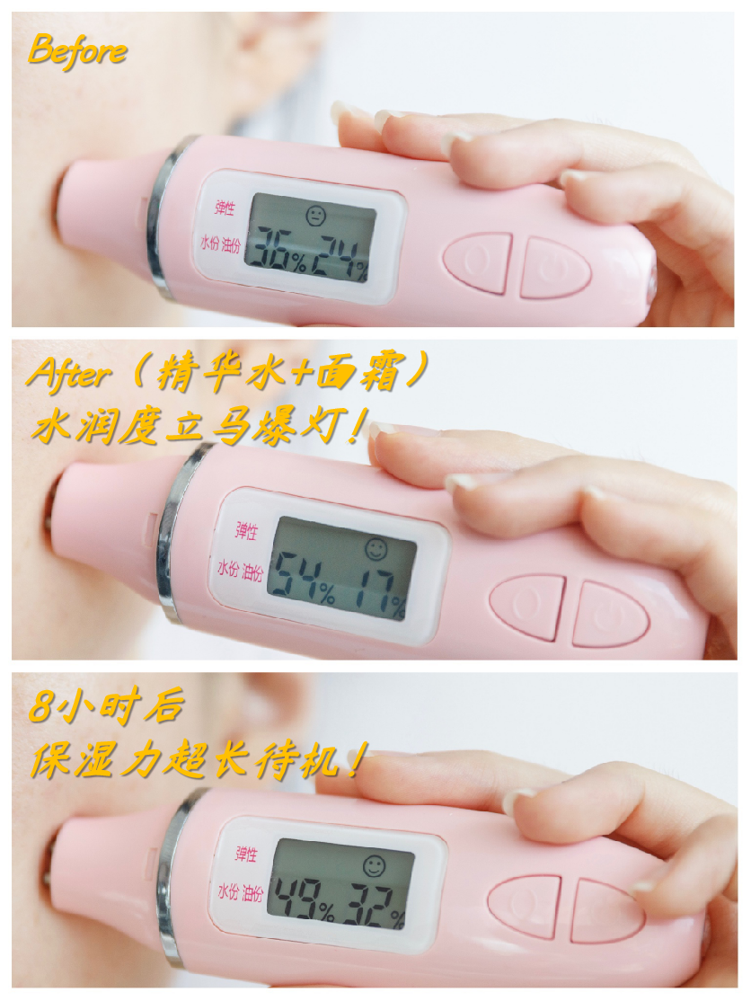 我特地做了测评,精华水+面霜能把皮肤水润度嗖一下提升,在空调房里待一天,数据还是很漂亮,脸上更是刚刚好的润泽。