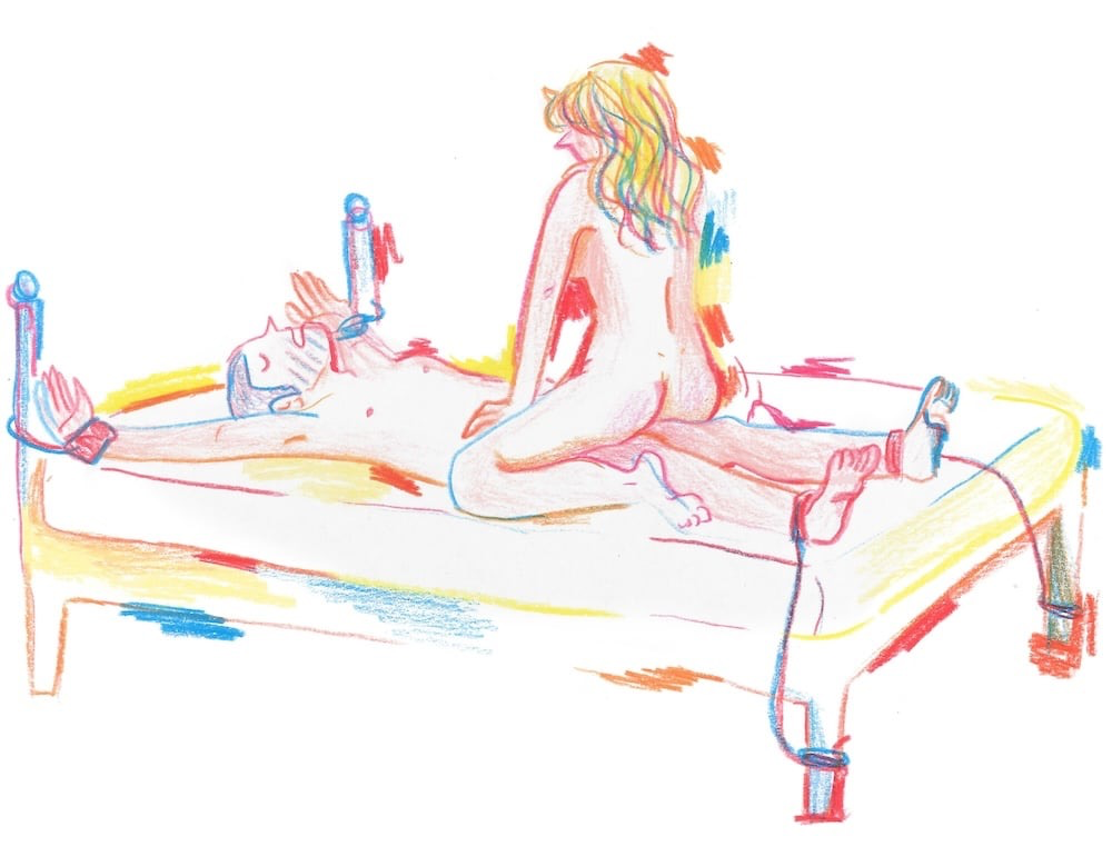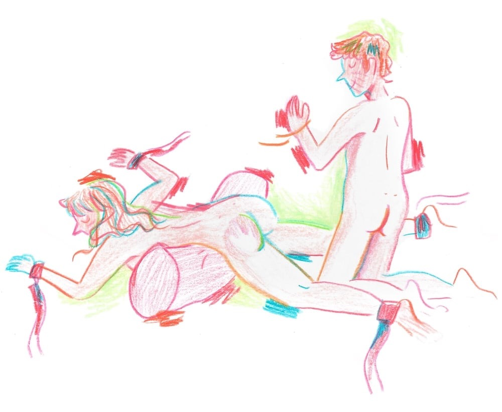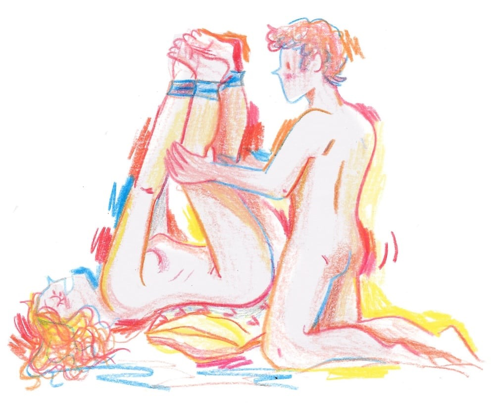抓住被束缚伴侣的腰部,给彼此增加稳定。 可以伸手在被束缚伴侣的音蒂上使用小玩具,增加快感。