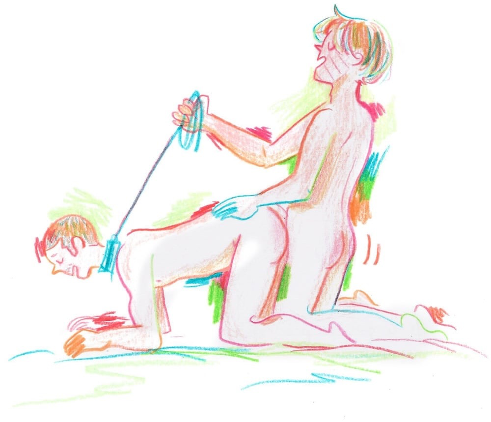 可以在每一次用力时都把绳索拉得更紧。(注意不要突然或过度拉扯牵引绳) 用牵绳鞭打伴侣的屁股。 让伴侣用嘴叼住皮带。