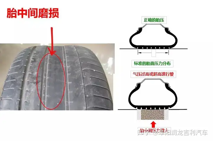 高胎压:如果轮胎气压过高,轮胎的刚性增大,变形和接地面积减小,首先会导致使胎面中部的单位压力增大,磨损加剧,产生胎冠中央磨损现象,影响到舒适性并将降低轮胎寿;同时,还会使轮胎抓地力减少(尤其在湿滑路面,会影响制动距离),也会造成轮胎的磨损速加快,导致轮胎磨损不均匀。