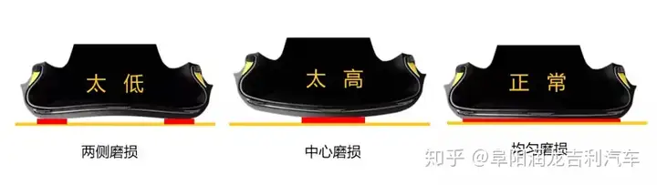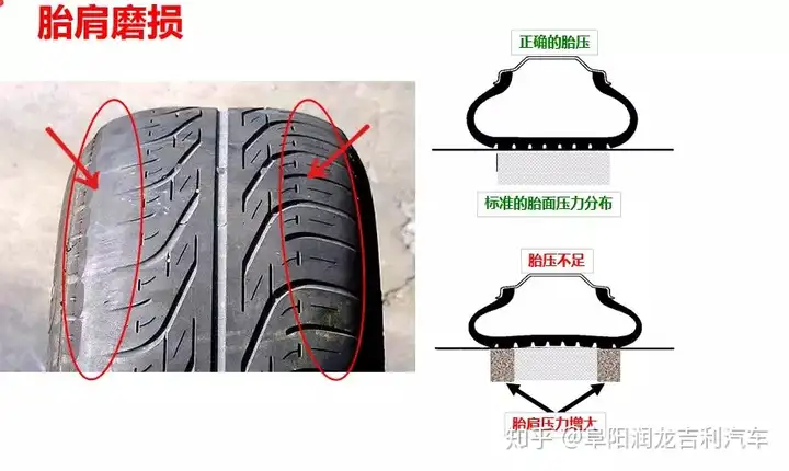 低胎压:与高胎压磨损中心相反,胎压过低,则胎冠内缩,会导致轮胎两侧的磨损。而且,胎压低与扁平比小有类似情况,胎侧受挤压时,轮毂与地面直接撞击,也很容易造成帘布层线的断裂,要么爆胎,要么鼓包。
