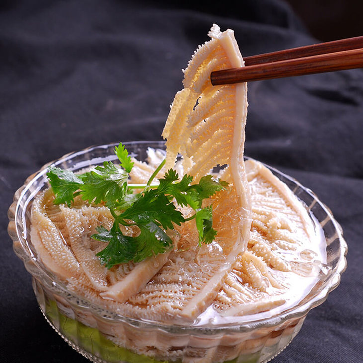 👍取大块牛毛肚,采用木瓜蛋白酶发制技术、安全泡发,泡发后毛肚颜色呈淡黄色! 木瓜蛋白酶是一类蛋白水解酶,对蛋白质起作用,对肉类蛋白进行适当的水解还原了牛肚原有的嫩脆口感!