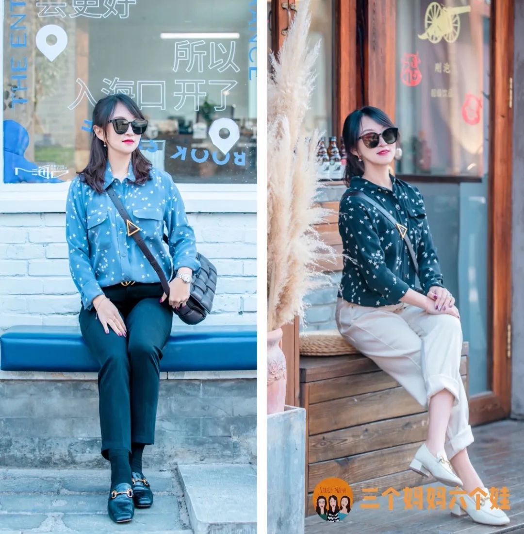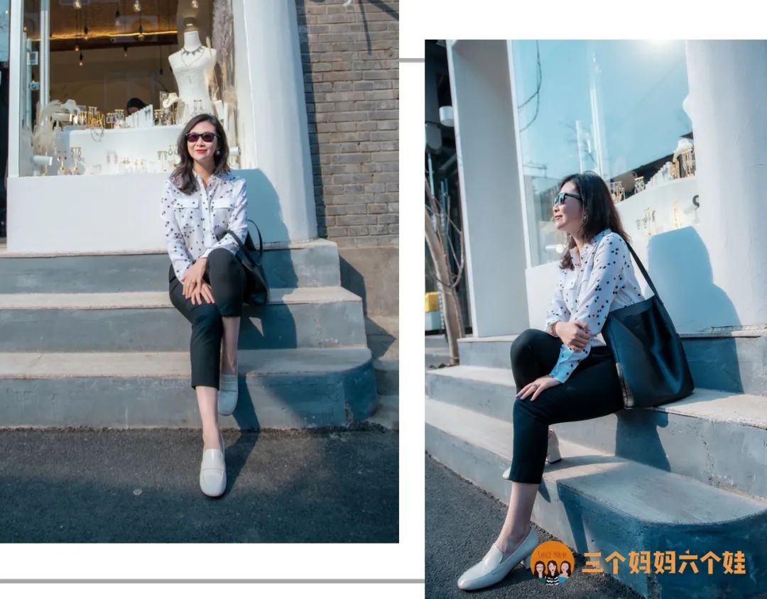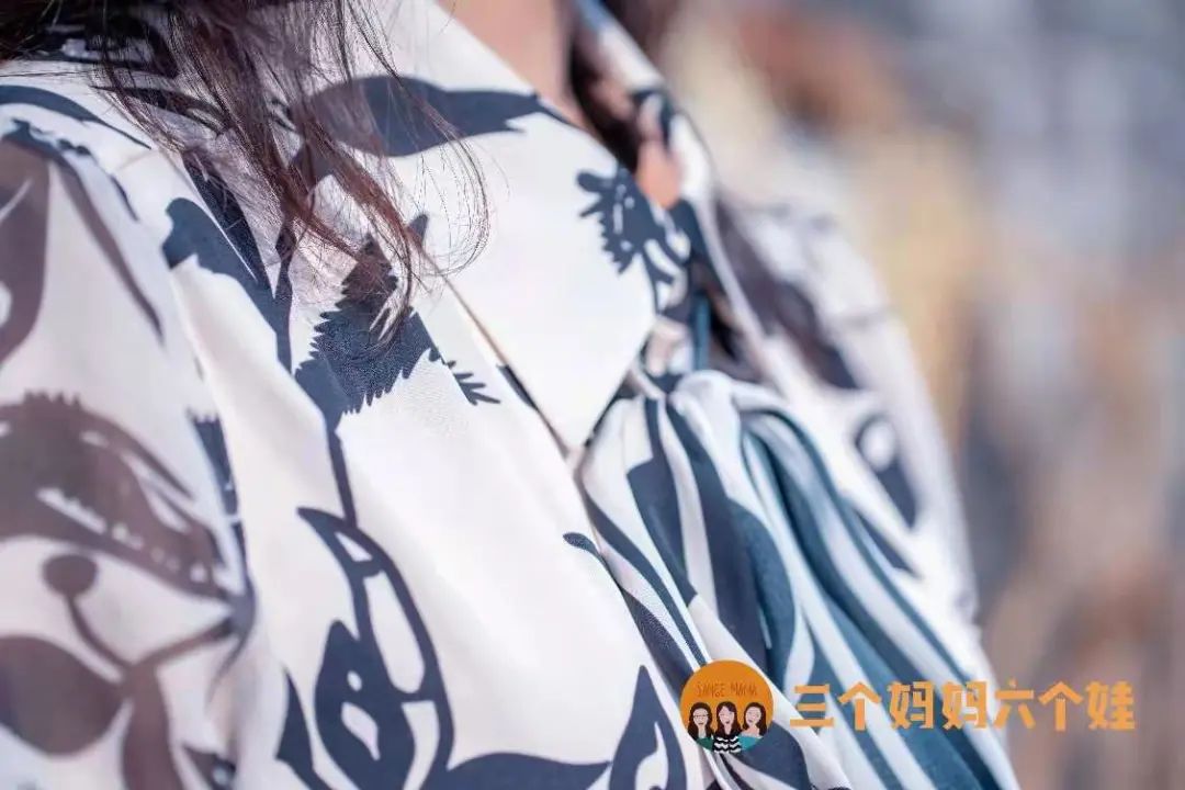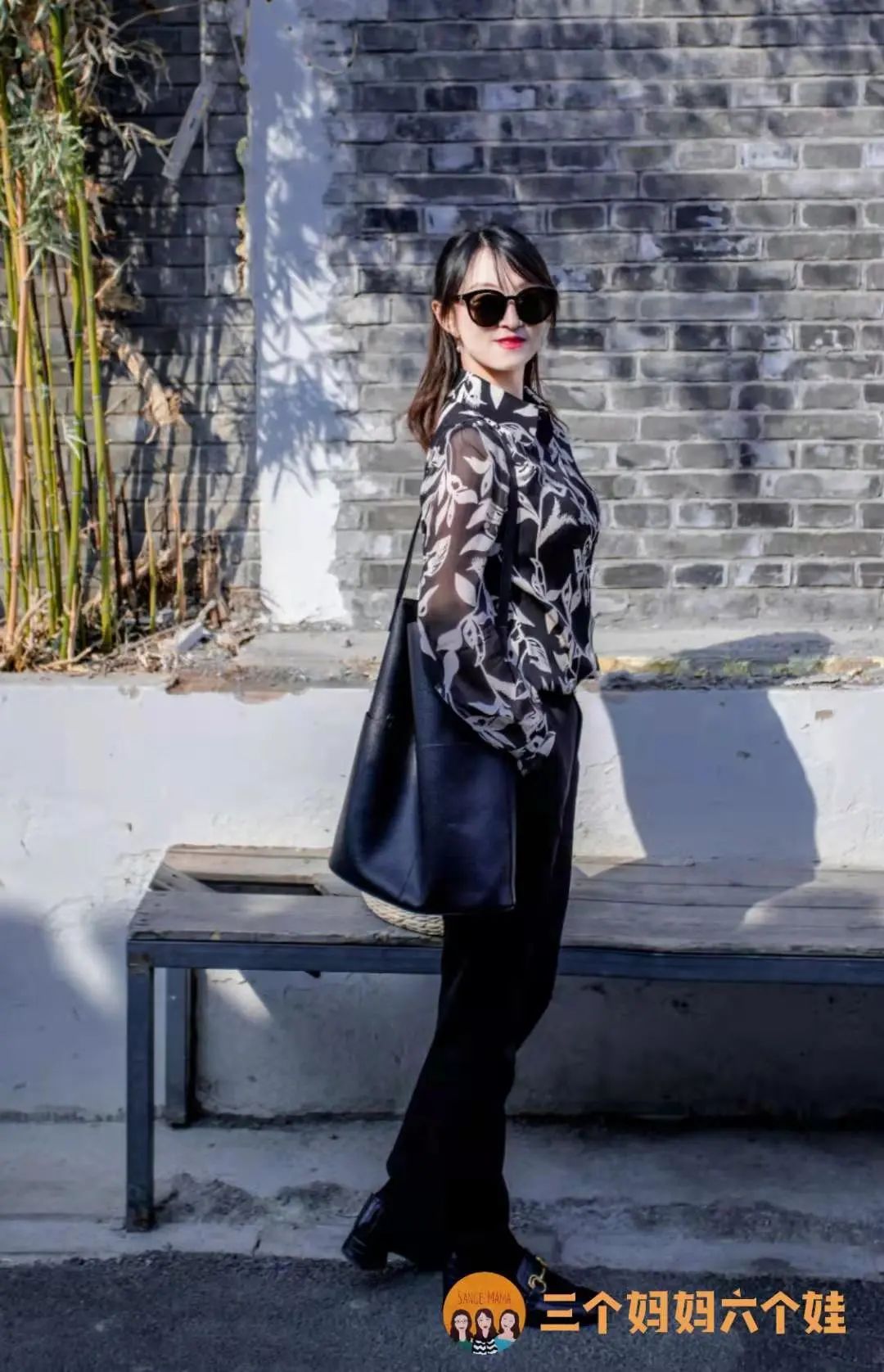 同款还有黑底白花。大家可以看看啾啾妈的通勤搭配,让黑裤黑包瞬间不沉闷了,很有女人味。