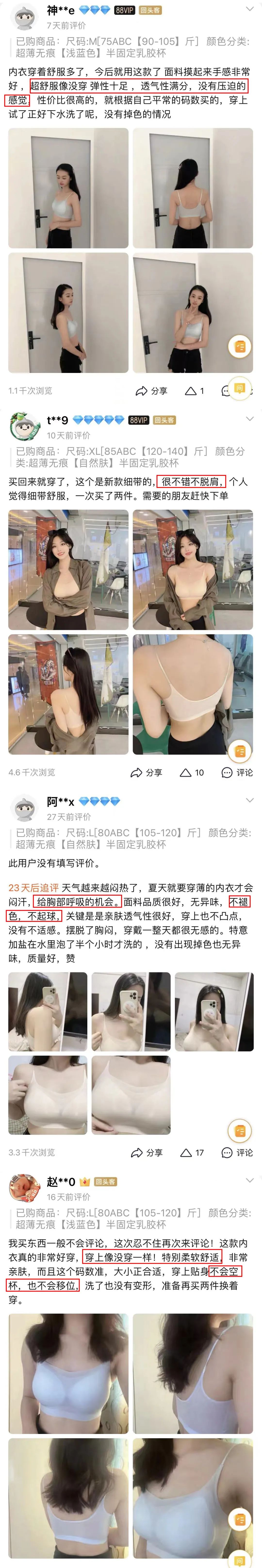 “面料舒服,聚拢效果好”、“透气性满分,无压迫”、“不褪色不起球”、“穿上像没穿一样,特别柔软舒适”、“不空杯,不移位”