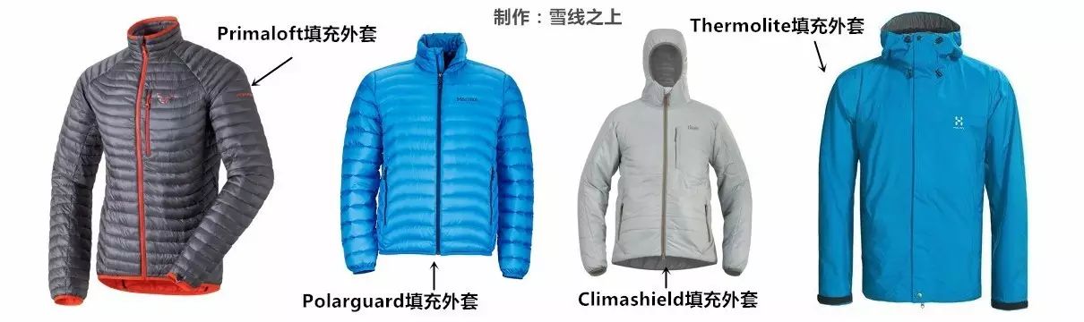 合成材料如Primaloft,Polarguard,Climashield,Thermolite等,共同特质就是具有类似羽绒的蓬松度,同时潮湿后依然保暖。
