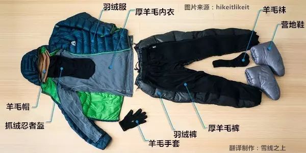 普通寒冷环境,营地活动保暖套装示例。图片来源:hikeitlikeit.com