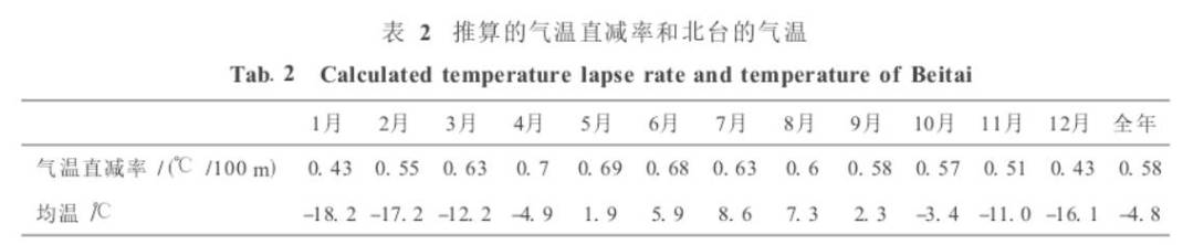 北台是本区海拔最高的地点,但没有气象台站。利用与北台水平距离最近、海拔相差最小的中台站和同一坡向的豆村站推算出气温直减率,再根据气温直减率推算出北台站的气温(表2)。