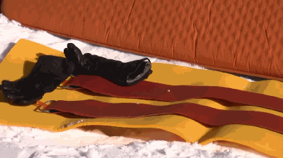 寒冷天气可以构建多层睡眠系统,在泡沫垫上防止需要烘干的物品,再垫上气垫,提供更高的热阻。动图来源:NOLS上传的《Winter Warmth | Camp and Sleep System》